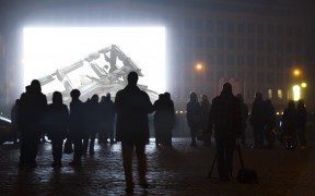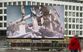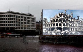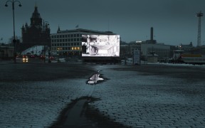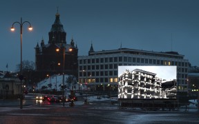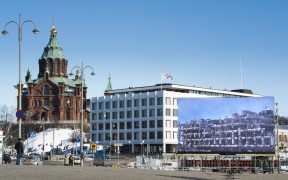 SUPERFLEX´s installation created for the IHME Contemporary Art Festival is a film and sculpture titled Modern Times Forever (Stora Enso Building, Helsinki). The work shows the Stora Enso building at Kanavaranta 1, Helsinki. The film will be shown in Helsinki Market Square on a 40m2 LED screen, so that the original building can be seen simultaneously with the building in the film. In the film the building changes all the time. The film lasts ten days, i.e. the work lasts as long as its exhibition period. This continuous exhibition period means that the film can be watched 24 hours a day for ten days.