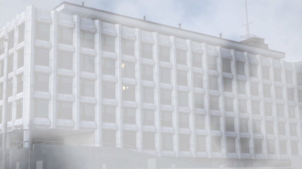 The presence of the IHME Project will add a new temporal dimension to the urban space. Apart from being present in our everyday lives, quietly changing for ten days, the film´s time races ahead at an estimated several-hundred-year gallop each day. The film is a fiction about what could happen to the Stora Enso building as an architectural and ideological symbol, over the next few thousands of years, if the days of humankind come to an end, and only time and the weather affect the building. Via the decaying image of Stora Enso’s headquarters, the work raises issues of climate change, urban planning, Finland’s industrial history, and changes in economic structures. Turn your everyday route towards the Market Square and take a look at the future! The Stora Enso building is an important cityscape landmark, whose style has prompted discussion ever since it was built. The building, referred to by the locals as “the sugar cube”, is Alvar Aalto´s design and was completed in 1962. Its clean white modernist exterior has been an object of love and hate ever since its completion – especially since the spot was previously occupied by a Neo-Renaissance urban palace, the Norrmén house, designed by Theodor Höijer.