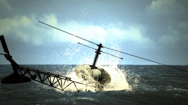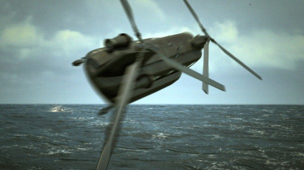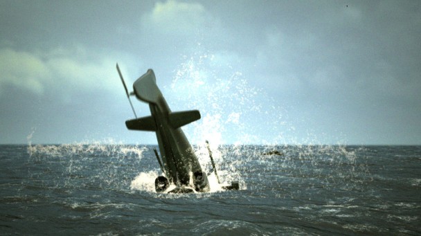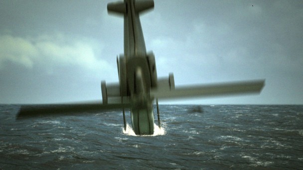 Projected large-scale in a museum setting, South China Sea Pishkun shows the machinery of war in its last moments, crashing, struggling and dying in the sea.